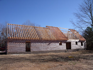 It is looking more and more like a house these days. The framers we hired (best investment so far) have really been moving quickly. It is really nice to see the house with rafters on it because now we can really get a feel for how it is going to look. So far we are pretty happy with how things are turning out with one exeption, our bedroom. It is not bad, but it got a little smaller than we would have liked. Thats not too big of a problem for us though because we really don't figure we will need that much space in there. There is luckily a lot of room everywhere else!